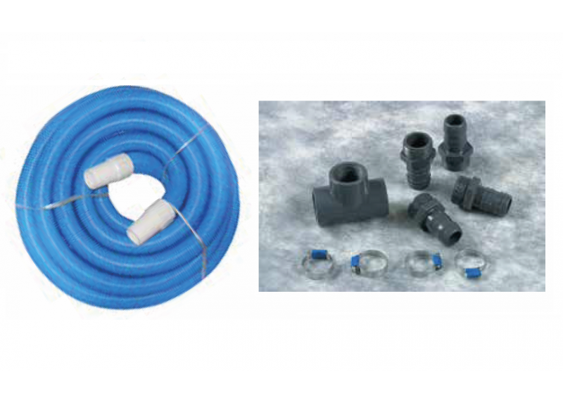 Kit per il collegamento della piscina al gruppo filtrante, composto da: 9 m tubazioni diametro 38 mm, n.4 fascette inox, n.1 rotolo teflon.